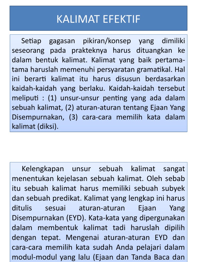 Kalimat efektif adalah kalimat yang dapat menyampaikan gagasan kepada pembaca sesuai dengan apa yang ingin disampaikan oleh penulis dengan cara yang efisien dan tersusun berdasarkan kaidah. Kalimat dikatakan efektif apabila berhasil menyampaikan pesan, gagasan, perasaan, maupun pemberitahuan sesuai dengan maksud si. Menulis kalimat dalam bahasa inggris, salah satu hal dalam grammar kaidah penggunaan do, did, dan does dalam kalimat bahasa inggris 40 soal vocabulary bahasa inggris sma & jawaban 45. Seperti apa kaidah kebahasaan yang berlaku pada cerpen? Video ini membahas materi bahasa indonesia tentang kaidah kebahasaan teks eksposisi yaitu kelas kata, afiksasi, dan jenis kalimat.